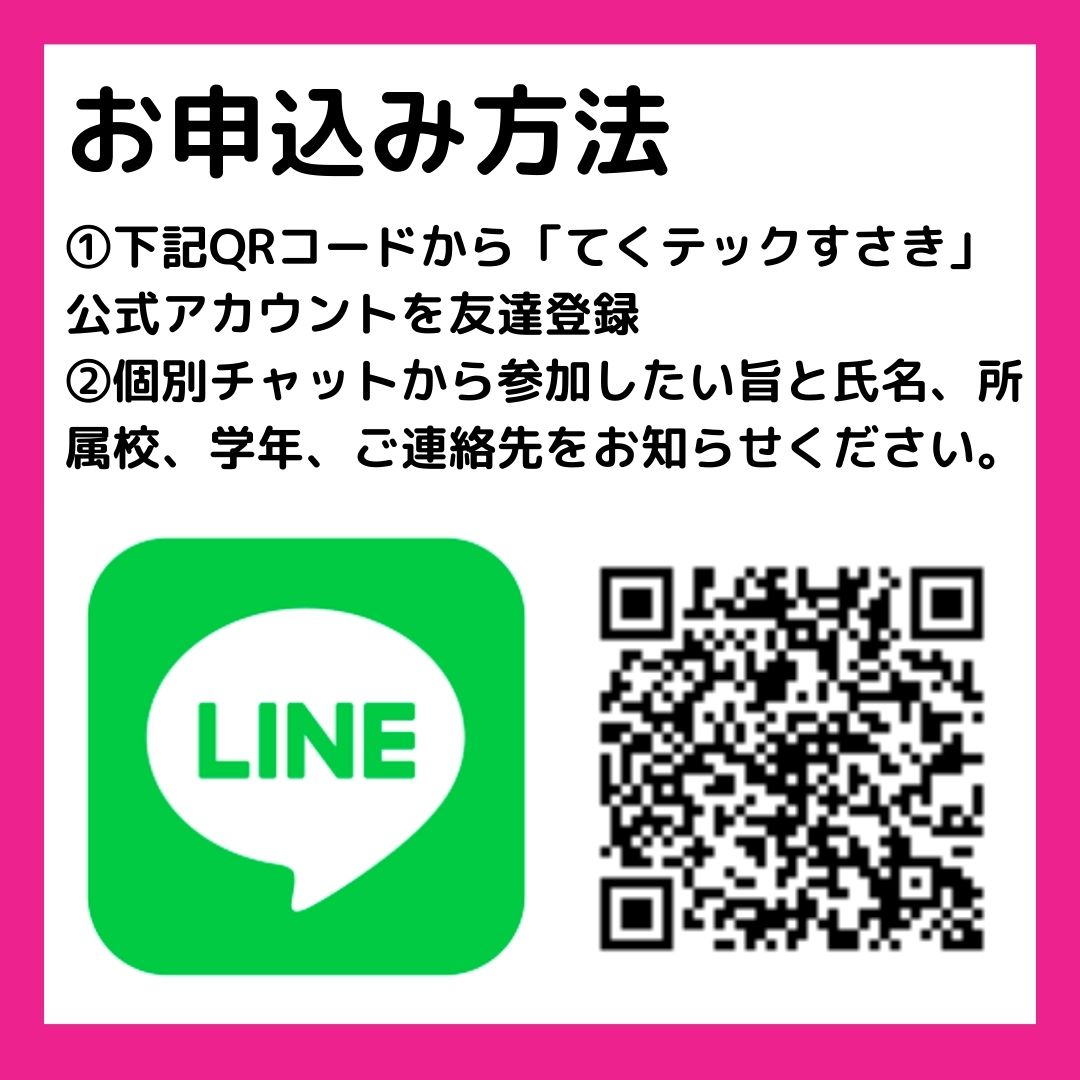 申し込み方法:下記「てくテックすさき」公式アカウントの個別チャットから、参加したい旨と氏名、所属校、学年、ご連絡先をお知らせください。