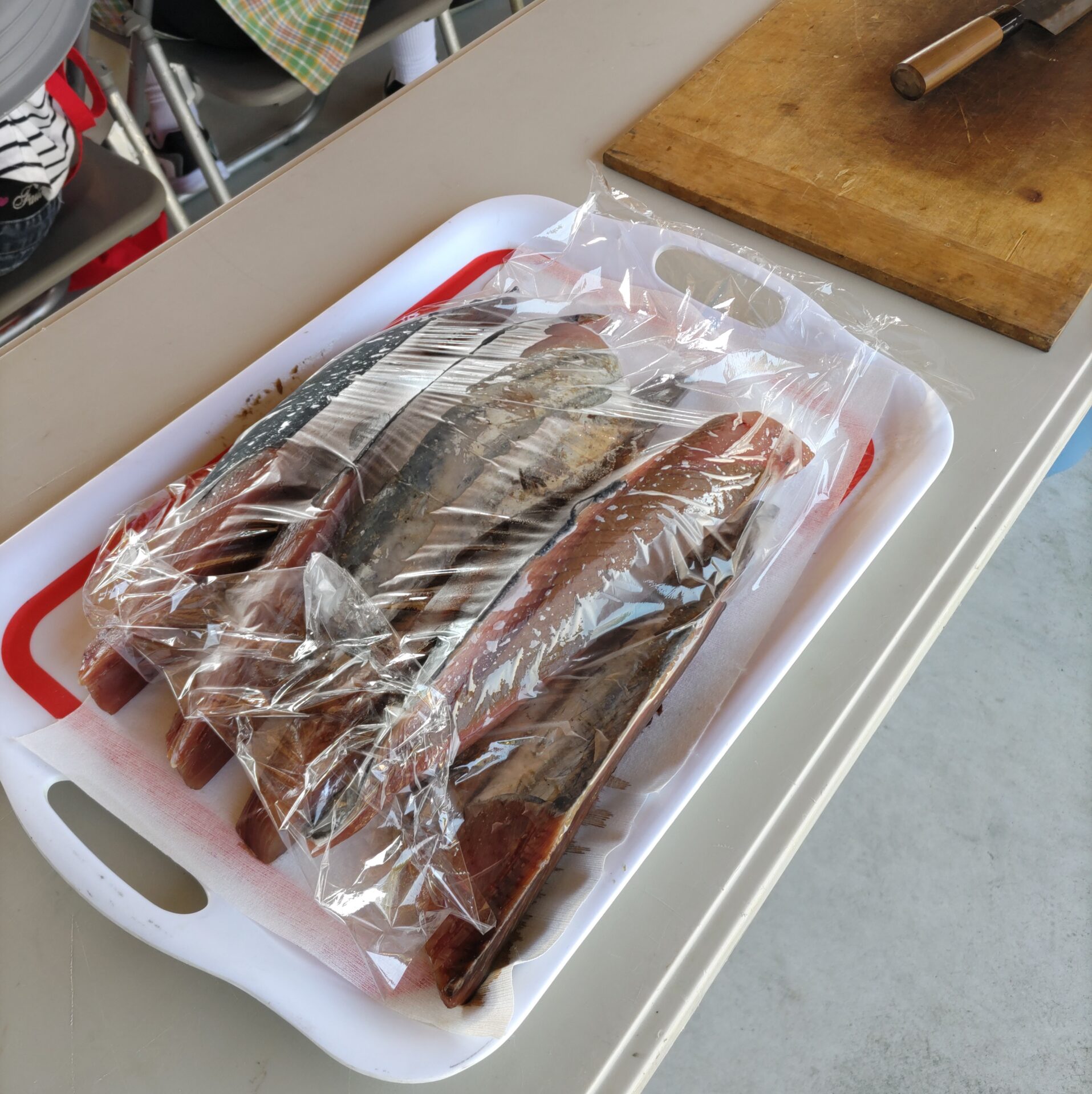 タタキにしたカツオは自分の分とお父さん、お母さんの分も切り分けます。