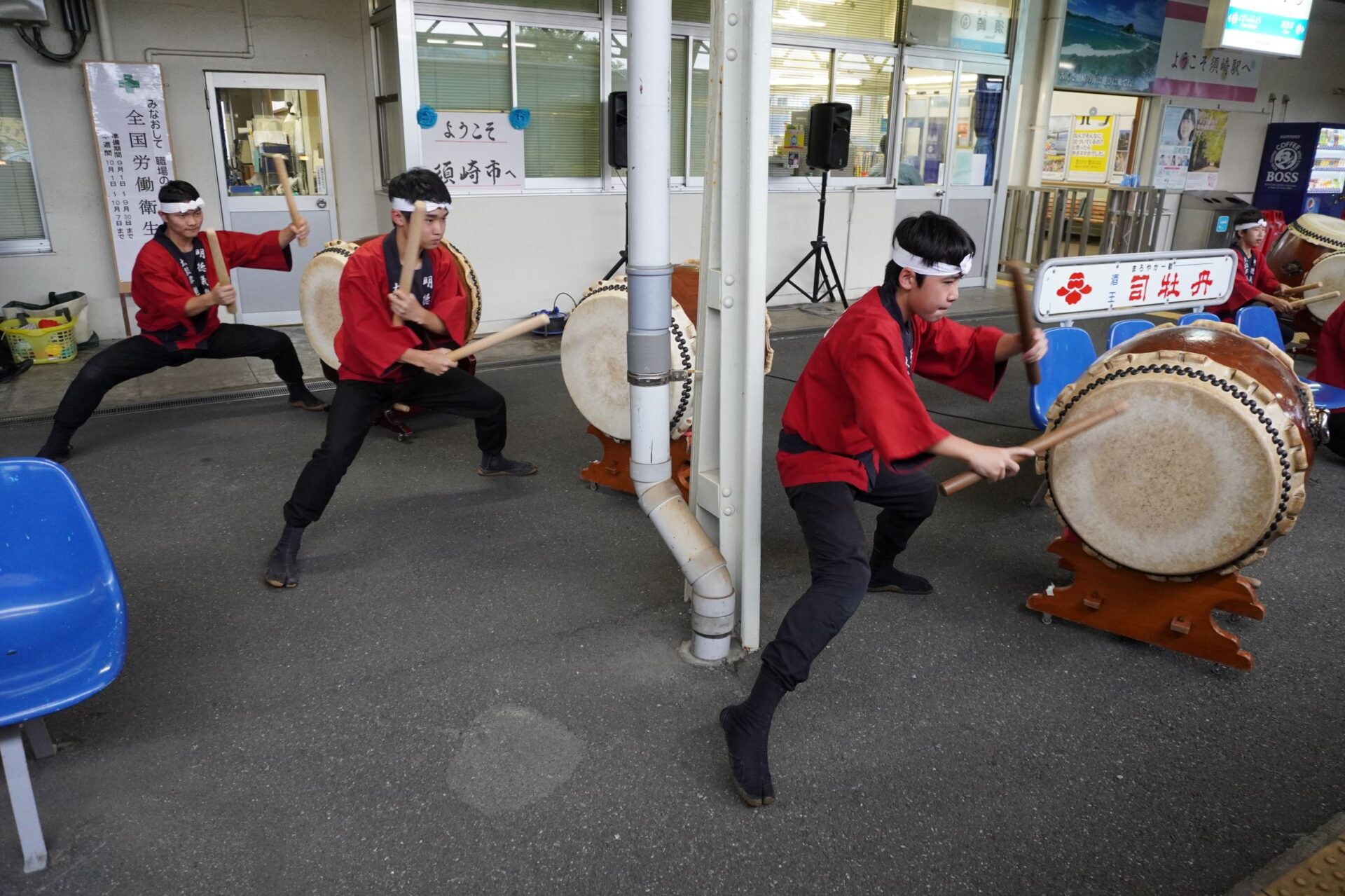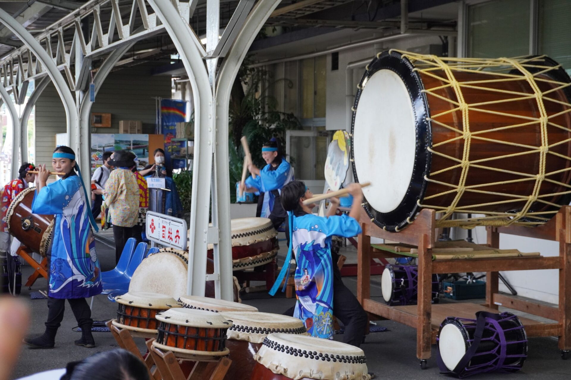 魅鼓の皆さんは若さ溢れる力いっぱいの和太鼓演奏でおもてなしをしてくださり、毎回、演奏後には駅構内に拍手喝采が起きます。