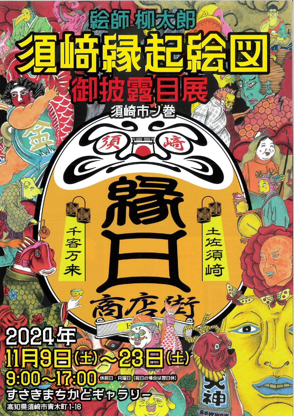 東京築地生まれ。シュルレアリスムや日本伝統美術の強い影響を受け、独自の色彩感覚で緻密に世界を描く画家です。2年前、初めて訪れた須崎で深く感銘を受け、数々の作品を生み出しました。須﨑大漁堂、須﨑のサカナ本舗、須﨑縁日商店街のロゴなど、印象的なデザインを手がけ、須崎市のイメージを彼独自の感性で表現しつつ、作品に昇華させています。