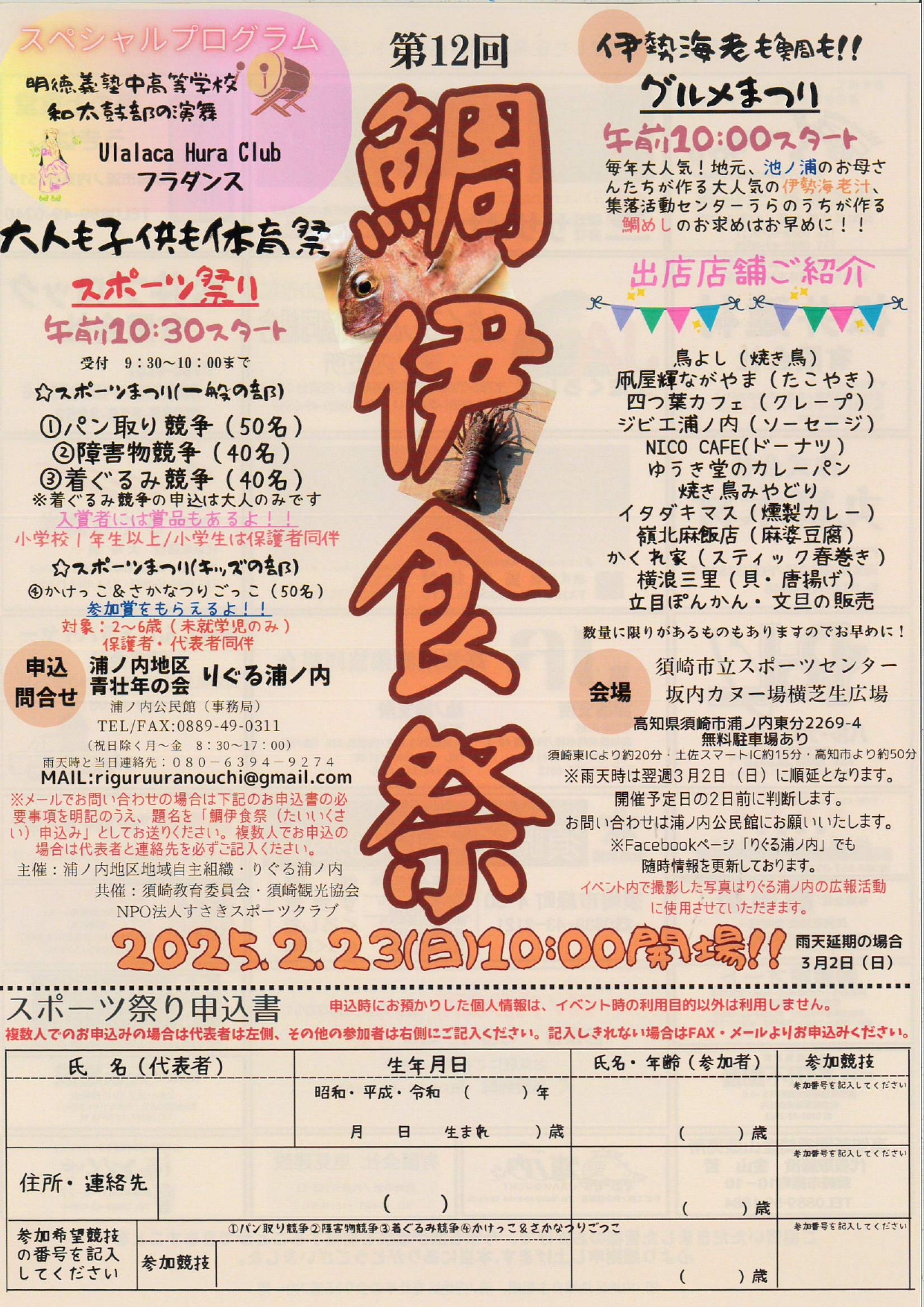 ※メールでお問い合わせの場合は下記のお申込書の必要事項を明記のうえ、題名を「鯛伊食祭(たいいくさい)申込み」としてお送りください。複数人でお申込の場合は代表者と連絡先を必ずご記入ください。