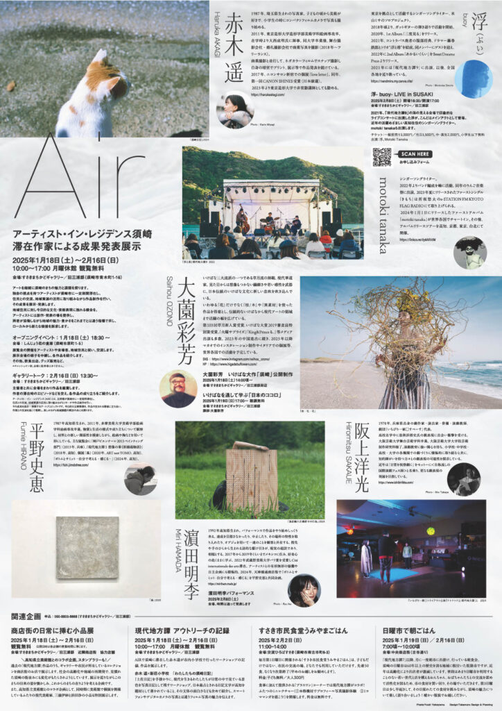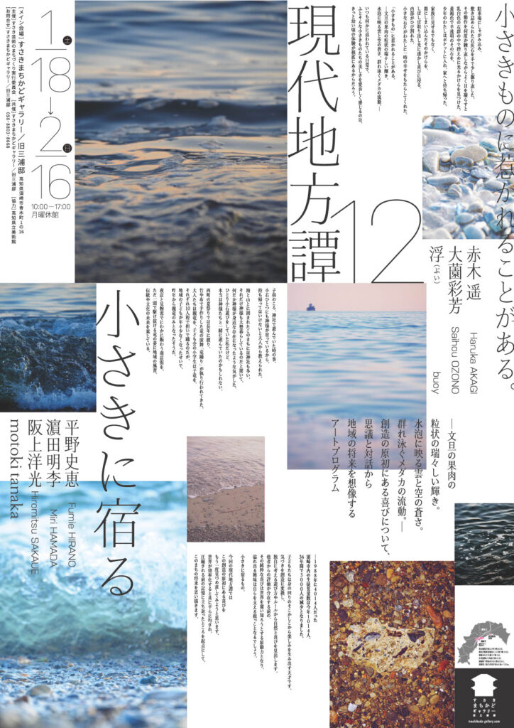 現代地方譚12回 小さきに宿る 高知食展覧会体験 終了 2025年01月18日〜2025年02月16日 イベント概要 【詳細】 https://airsusaki.machikado-gallery.com/ 開催期間2025年01月18日〜2025年02月16日開始時間10:00終了時間17:00