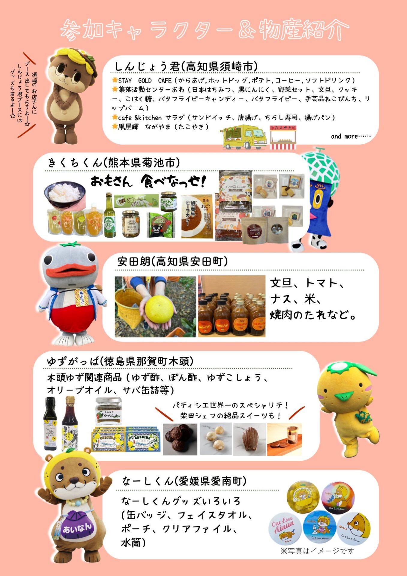 ご当地キャラちゃんが地元の物産やおいしいものをもちよる「なかよし物産展」