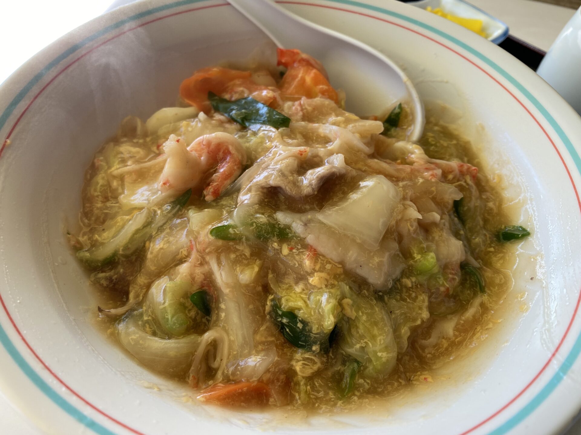 海鮮、豚肉、白菜、人参、タケノコなど、具たくさんのあんかけが最高!