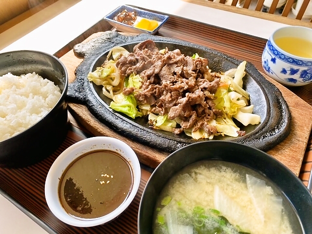 熱々鉄板上の焼肉に甘辛タレが良く合います(焼肉定食)