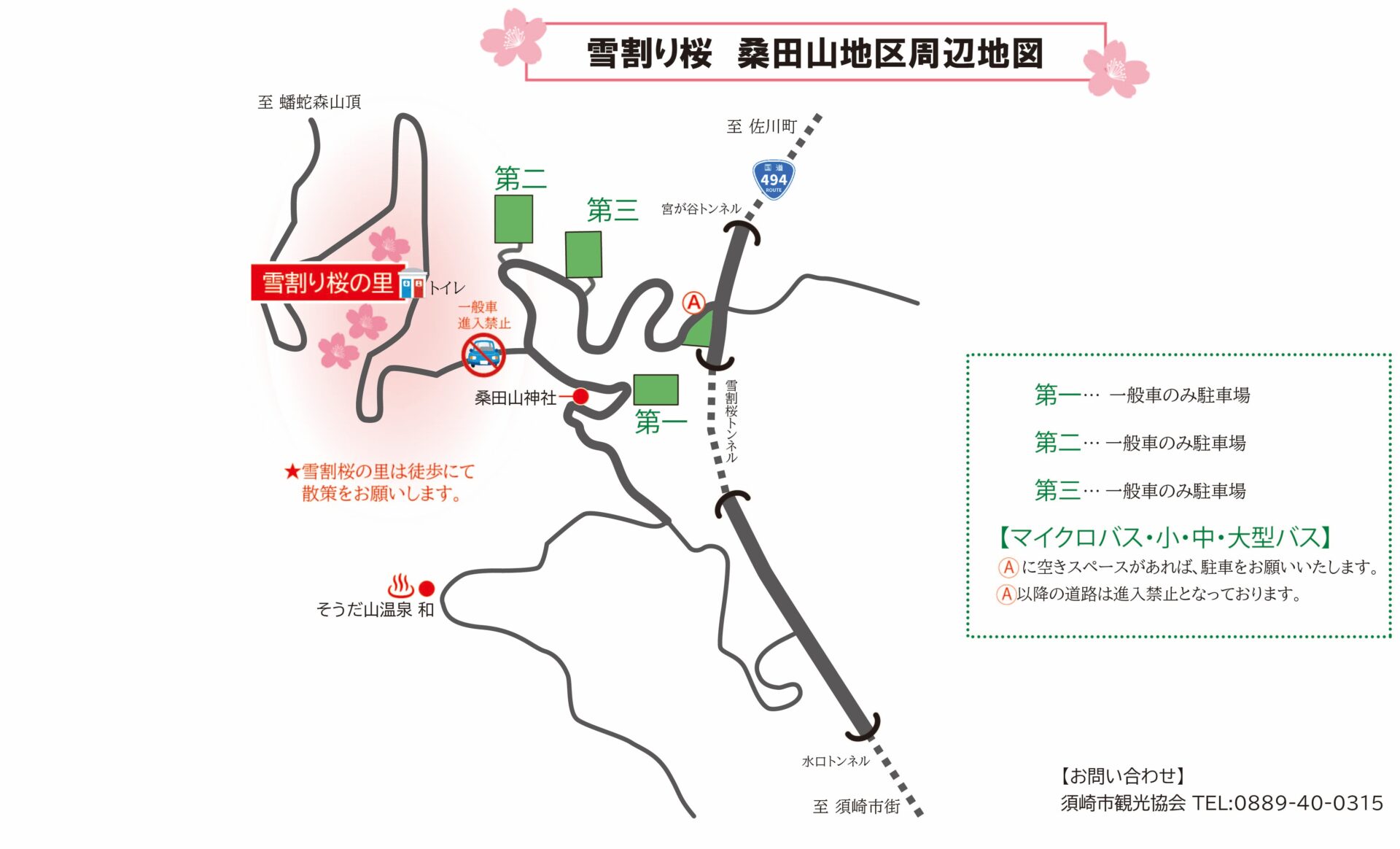 ①マイクロバス、小型バス、中型バス、大型バスは国道494号線沿いの空きスペース(Ⓐ)への駐車をお願いします。