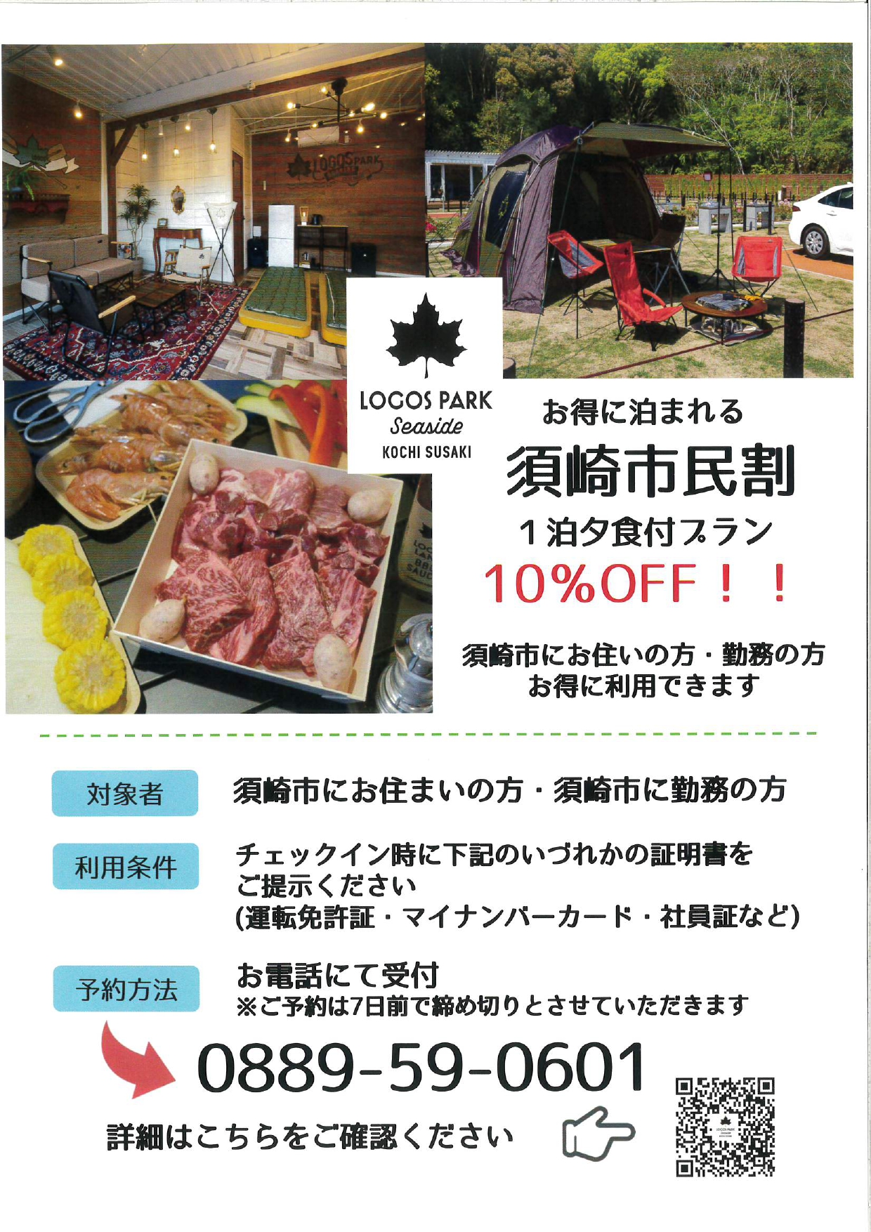 ロゴスパークにお得に泊まれる『須崎市民割』!! *1泊夕食付プランが10%OFF