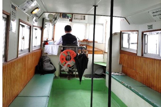 田舎の交通インフラ感満載の船内です(エンジン音がちょっとうるさいけど、、、)